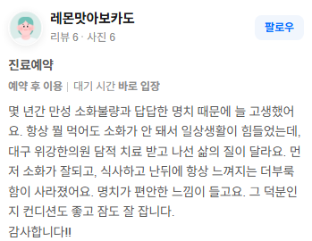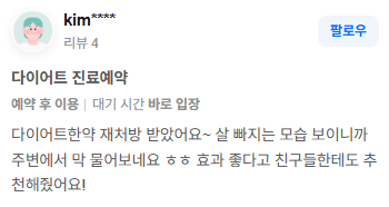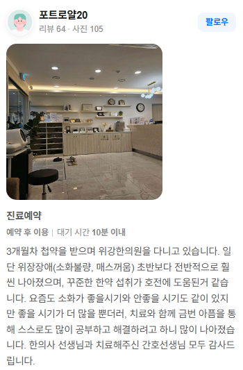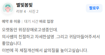 위강한의원에서 치료받은 실제 치료후기 리뷰를 모았습니다. 가감 없는 리얼후기 참고하시면 질환치료에 더욱 도움이 되실겁니다.