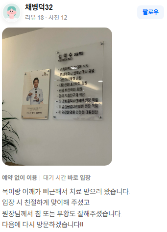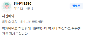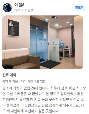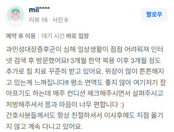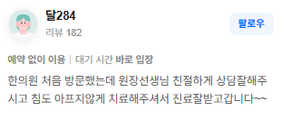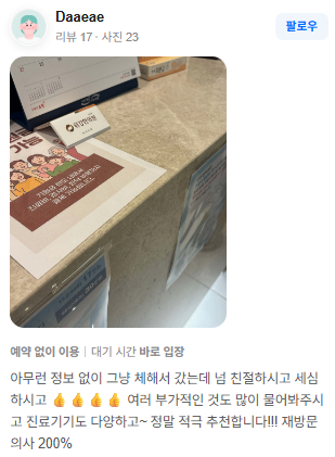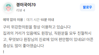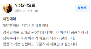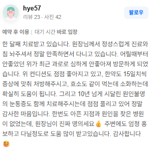 위강한의원에서 치료받은 실제 치료후기 리뷰를 모았습니다. 가감 없는 리얼후기 참고하시면 질환치료에 더욱 도움이 되실겁니다.