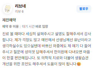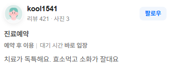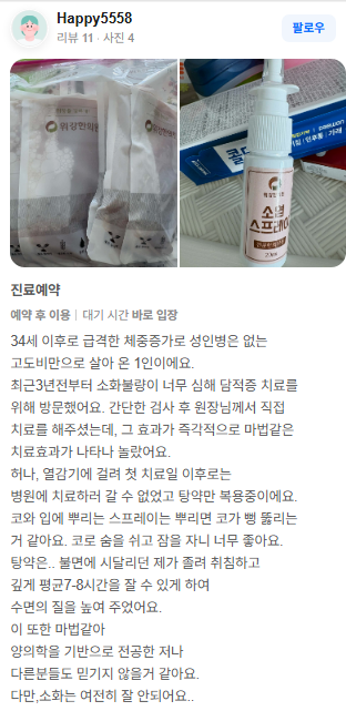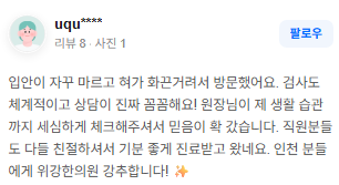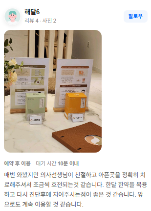 위강한의원에서 치료받은 실제 치료후기 리뷰를 모았습니다. 가감 없는 리얼후기 참고하시면 질환치료에 더욱 도움이 되실겁니다.