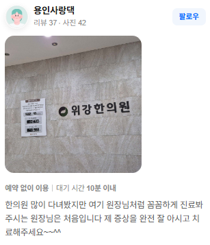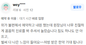 위강한의원에서 치료받은 실제 치료후기 리뷰를 모았습니다. 가감 없는 리얼후기 참고하시면 질환치료에 더욱 도움이 되실겁니다.