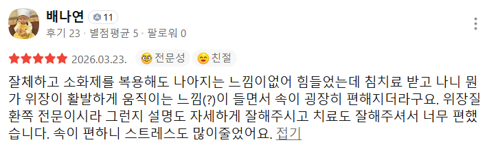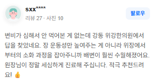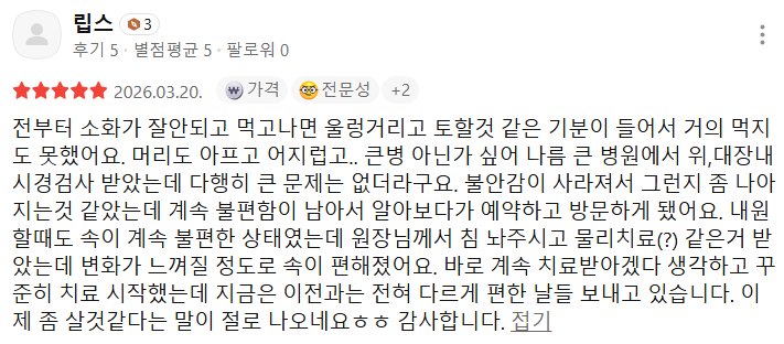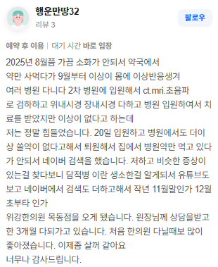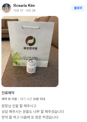 위강한의원에서 치료받은 실제 치료후기 리뷰를 모았습니다. 가감 없는 리얼후기 참고하시면 질환치료에 더욱 도움이 되실겁니다.