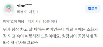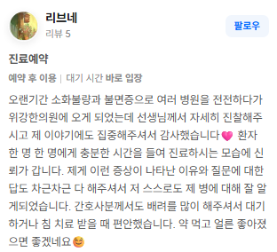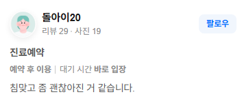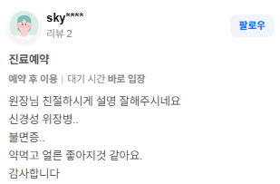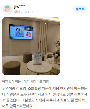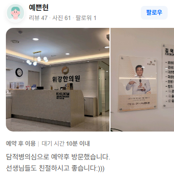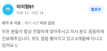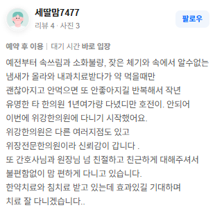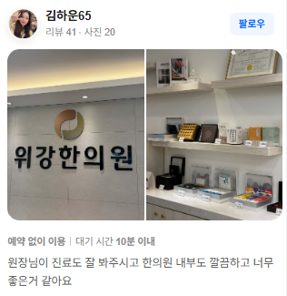 위강한의원에서 치료받은 실제 치료후기 리뷰를 모았습니다. 가감 없는 리얼후기 참고하시면 질환치료에 더욱 도움이 되실겁니다.