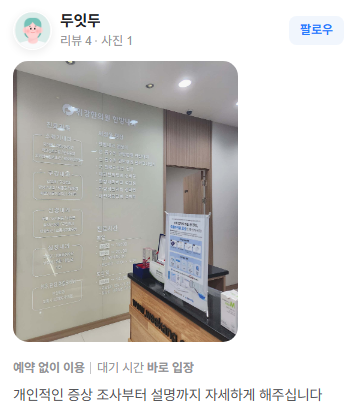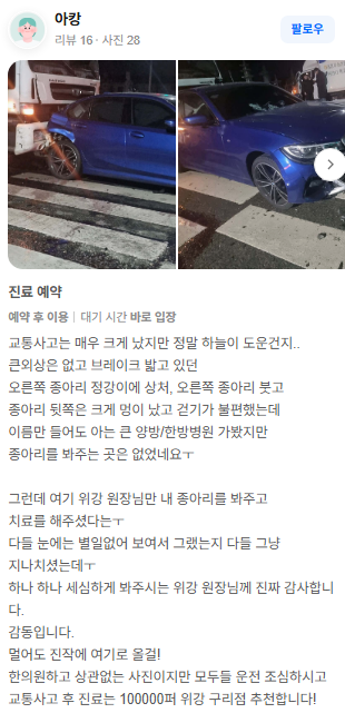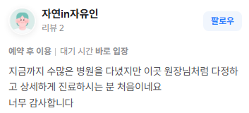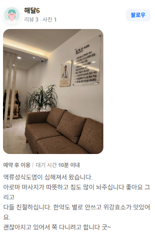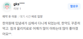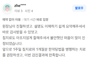 위강한의원에서 치료받은 실제 치료후기 리뷰를 모았습니다. 가감 없는 리얼후기 참고하시면 질환치료에 더욱 도움이 되실겁니다.