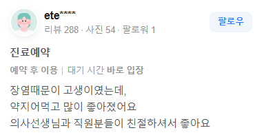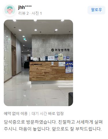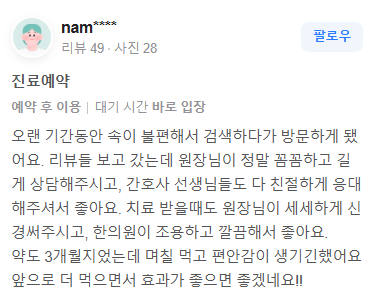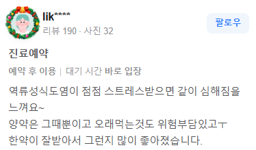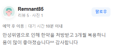 위강한의원에서 치료받은 실제 치료후기 리뷰를 모았습니다. 가감 없는 리얼후기 참고하시면 질환치료에 더욱 도움이 되실겁니다.