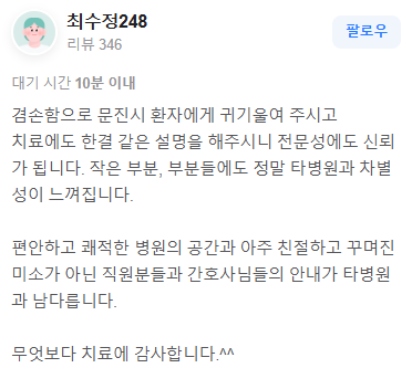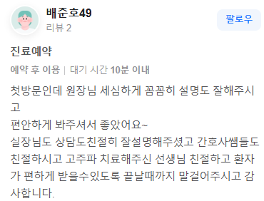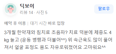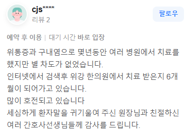 위강한의원에서 치료받은 실제 치료후기 리뷰를 모았습니다. 가감 없는 리얼후기 참고하시면 질환치료에 더욱 도움이 되실겁니다.