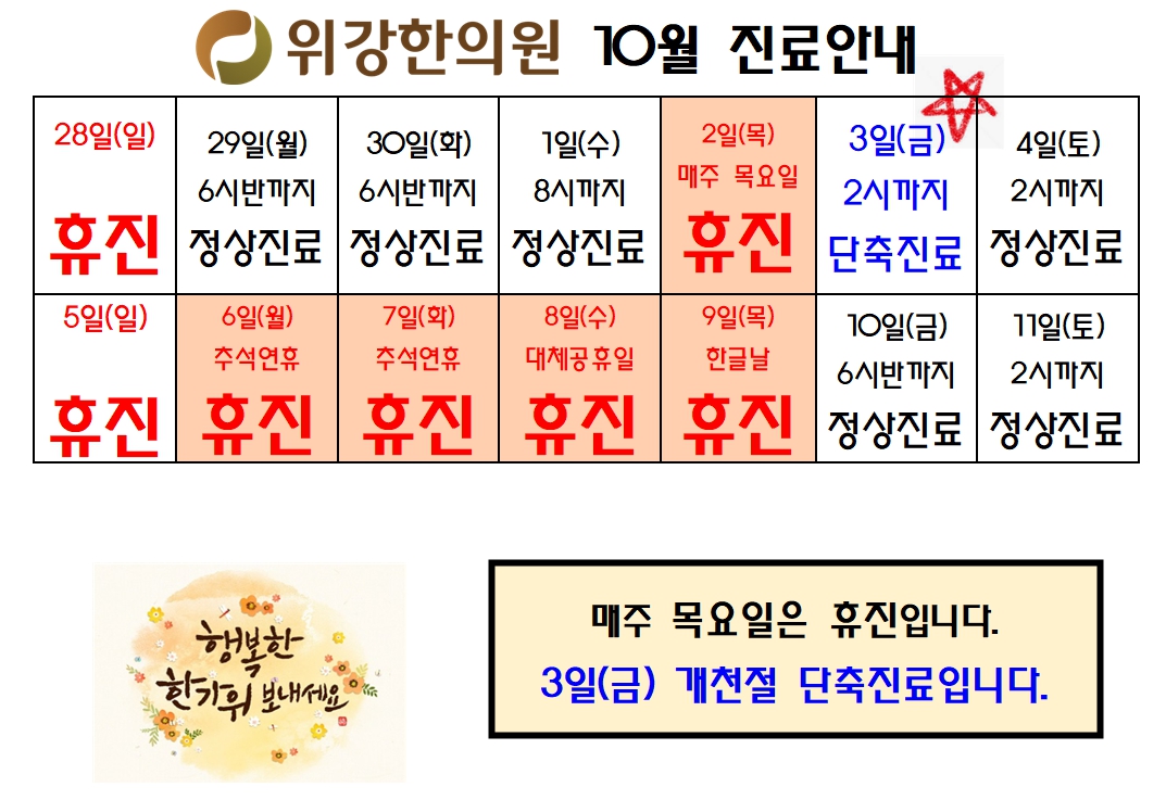 <10월 진료 안내> *추석 연휴, 한글날 10/6(월)~10/9(목) 휴진입니다. * 매주 목요일은 정규 휴진일입니다. |